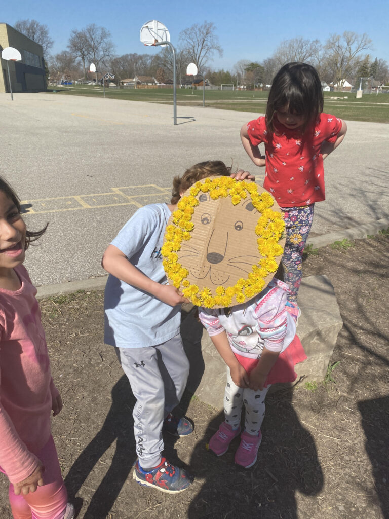 - Demonstrating Literacy and Mathematics Behaviours: Students use spatial awareness and counting skills when placing dandelions into holes and discussing shapes and patterns in nature.